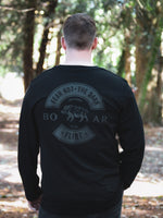 Our "Fear Not The Dark" collection on our classic long sleeved tee. Inspired by the thrill of boar hunting late at night here in the UK and the challenge of tracking such an elusive animal. Printed in slate grey against black to give a moonlit contrast.