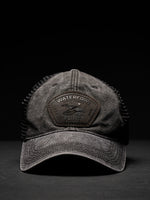 This baseball cap features an unstructured crown and a fully curved visor. The charcoal panels at the front are made from a distressed cotton twill paired with soft textured mesh and snapback closure at the back.