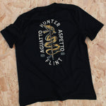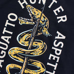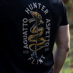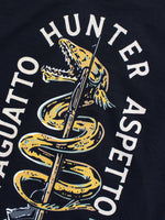A nod to our spearfishing heritage. "Aguatto Aspetto Hunter" features a conger eel enveloping a speargun, sporting the Italian terms for an ambush and active stalking spearo.